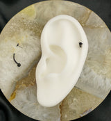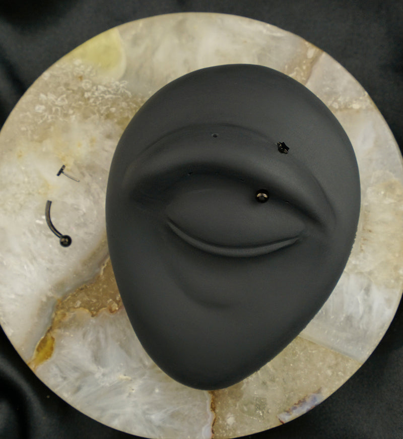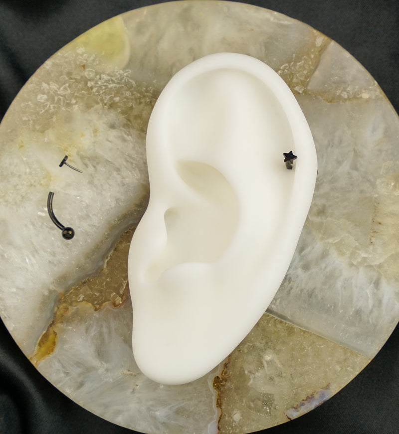 Curved barbells with a mini, star design on top. The top piece has a threadless design that makes it easy to put in and remove. The top design measures 3mm. Made from black pvd on ASTM F-136 titanium with an inner wearable length of 5/16" (8mm) and a 16G size. Complete with a 3mm ball on the bottom. Sold individually. Cool jewelry choice for eyebrow or rook piercings!