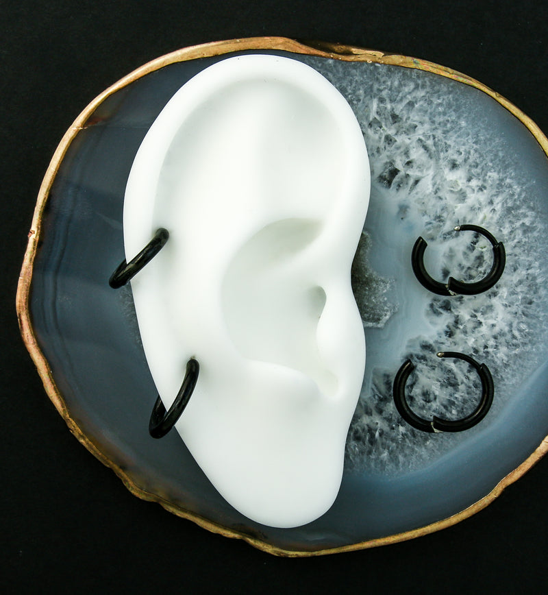 Made from Black PVD ASTM F-136 titanium, these hinged hoop huggie earrings come in pairs and are available in size 18G with inner diameters of either 5/16"(8mm) and 3/8"(10mm) for secure and comfortable everyday wear. These have a 2mm thickness and the hinged design make it easy to open and remove.