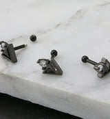 Barbell with a triangle shaped design on the end with a cut out and clear cz gem. Made from black pvd on 316L stainless steel and externally threaded. Edgy option for cartilage or tragus piercings! Size is 16G with a bar length of 1/4" (6mm). Ball size is 2.5mm. Sold individually. For healed piercings.