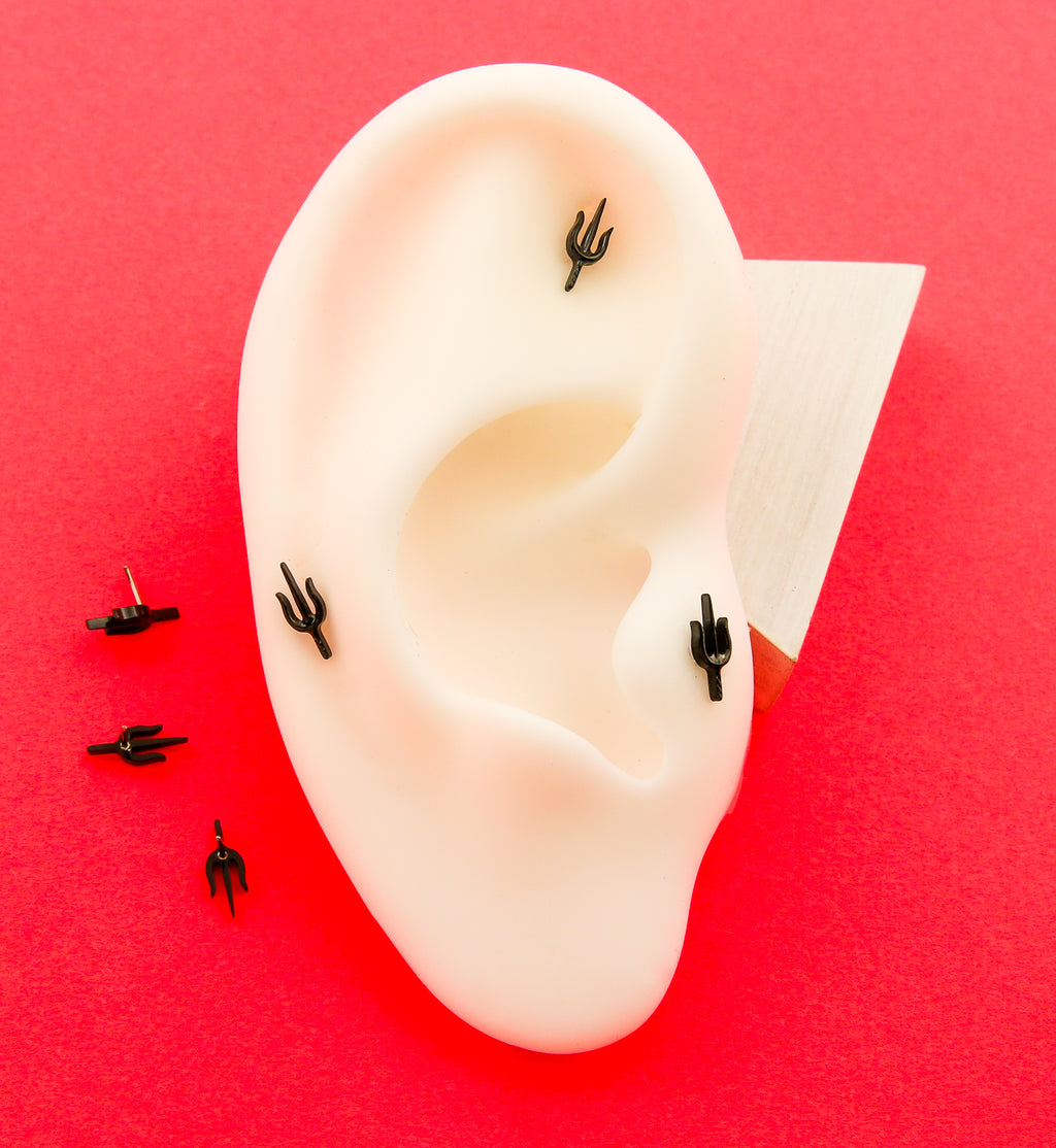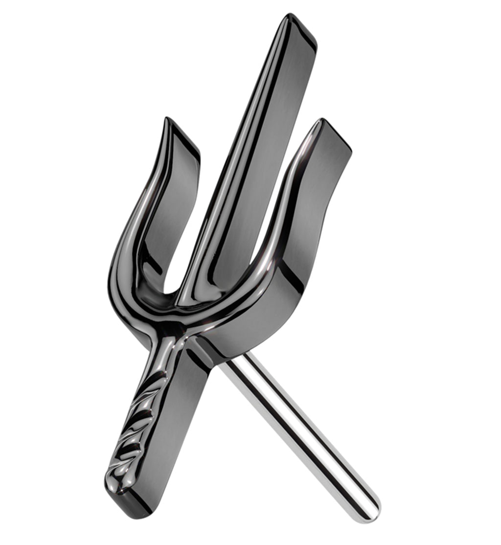 Rule the ocean with this dark titanium threadless top which has a trident design on top. This piece is made from black pvd on ASTM F-136 titanium and fits most threadless posts. Pin size is 25G. The top design measures 8mm x 3mm. Sold individually (1pc - top only).