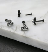 Internally threaded labret piece made of black pvd on ASTM F-136 titanium with clear cz gems in a spiral, swirling shape. Size is 16G. Choose your diameter size: 1/4" (6mm), 5/16" (8mm). Overall size is 6.5mm x 8mm x .25mm. Sold individually. For healed piercings.
