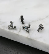 Internally threaded top piece made of black pvd on ASTM F-136 titanium with clear cz gems in a spiral shape. Choose your size from 16G and 14G. Striking piece to add to your internally threaded jewelry collection! Overall size is 6.5mm x 8mm x .25mm. Sold individually.