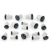 Cute glass plugs with a mushroom design with a black, spotted top. Single flares. Handcrafted and polished. Pick your size from 2G (6mm) - 1/2" (12mm). Full length is approximately 15mm. Comes with clear "O" rings. Sold in pairs (2pcs).