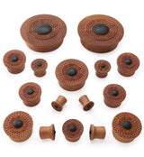Handcrafted mayan flare plugs made from saba wood with a hammered design, complete with a sun or star design with a black resin center. Cool pair to add to your plug collection! Each piece will be unique in color and pattern due to the nature of the wood. We will do our best to find you a matching pair. Available in sizes 00G (10mm) - 2" (51mm). For healed piercings/lobes. Sold in pairs (2pcs).