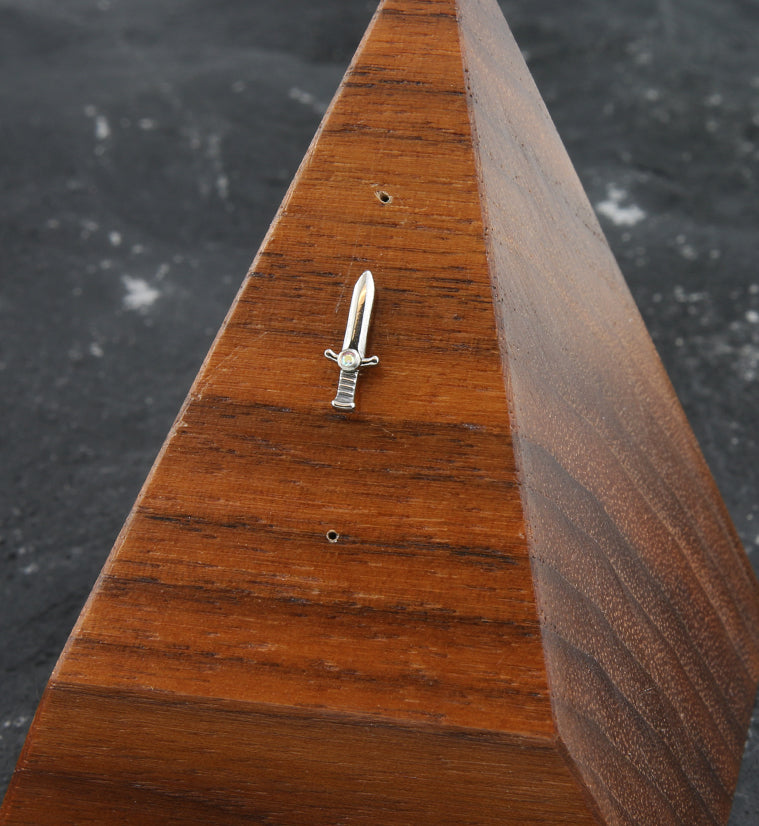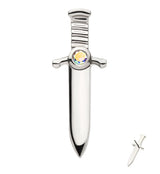 Threadless top piece that has a dagger shape with a small, 1mm rainbow aurora cz gem accent. Made from durable ASTM F-136 titanium. Measures about 10.5mm x 4mm. Fits most threadless posts. Sold individually (top piece only).