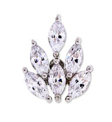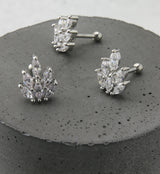 Barbell with a cluster of marquise, clear cz gems in the shape of a fire or bush. Made from 316L stainless steel and externally threaded. Fun option for cartilage or tragus piercings! Size is 16G with a bar length of 1/4" (6mm). End size is 8mm x 10mm. Sold individually. For healed piercings.