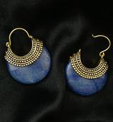 These brass earrings have a stunning design with a natural blue aventurine stone. Each piece has a height of 36mm and width of 30mm, give or take 1-2mm as these are handmade. Each earring weighs about 14 grams. Made from brass, these earrings are suitable for short-term wear, and may oxidize in extreme moisture conditions. Sold in pairs (2pcs).