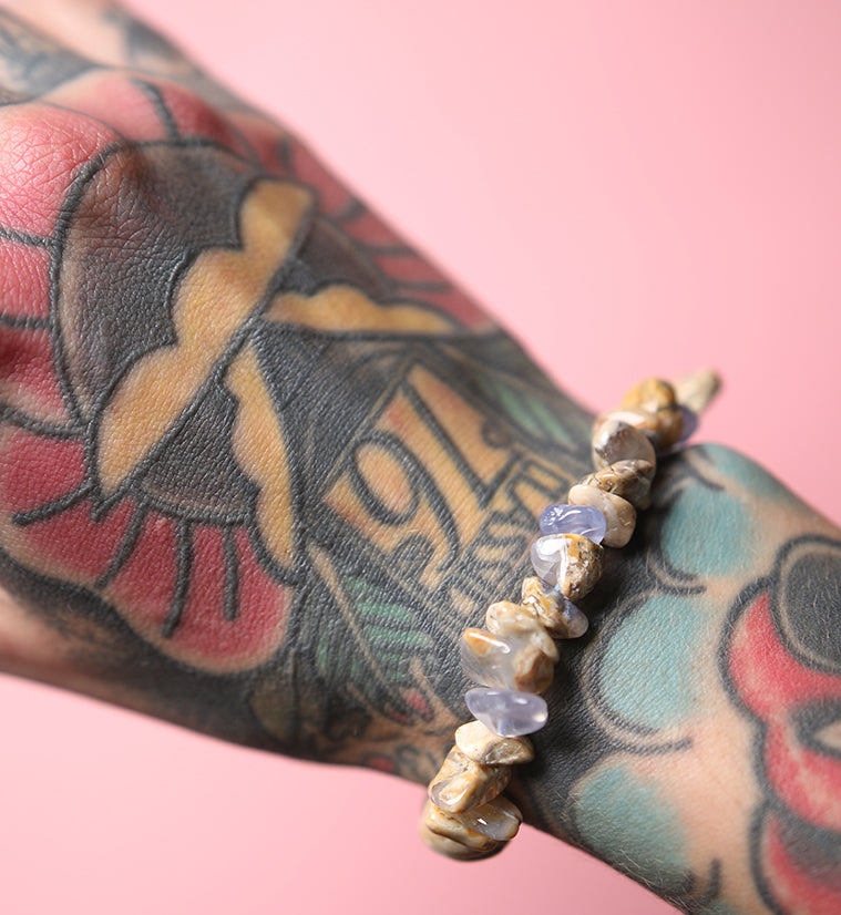 This stone bracelet is composed of natural blue chalcedony chips measuring between 8mm-16mm in size. Each chip is 100% unique in pattern, shape, design and color due to the nature of the stone. The elastic band ensures a secure and easy fit for the wearer. Handcrafted and polished. Sold individually (1pc).