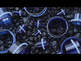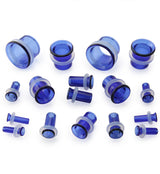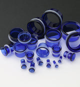 Get lost in these deep blue glass tunnels. Made of blue borosilicate glass, the single flare plugs are smooth for comfortable wear. Choose your size: 8 gauge (3mm), 6 gauge (4mm), 4 gauge (5mm), 2 gauge (6mm), 0 gauge (8mm), 00 gauge (10mm), 1/2 inch (12mm), 9/16 inch (14mm), 5/8 inch (16mm), and 3/4 inch (19mm), 7/8" (22mm), 1 inch (25mm). Sold in pairs (2pc).