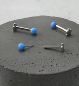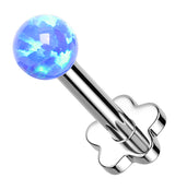 Threadless labrets with a shimmering synthetic blue opal gem ball on top and a flower shaped back. Size is 16G. Length is 5/16" (8mm). Flower back is 4mm. Made from ASTM F-136 titanium. Sold individually (1 pc).