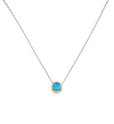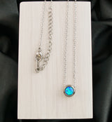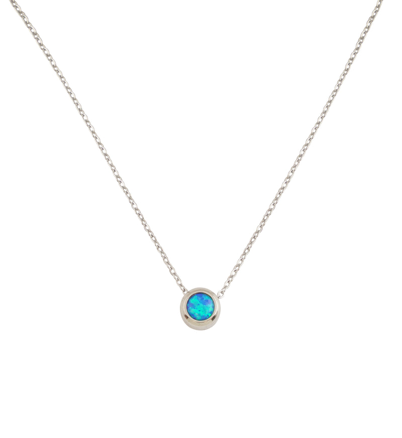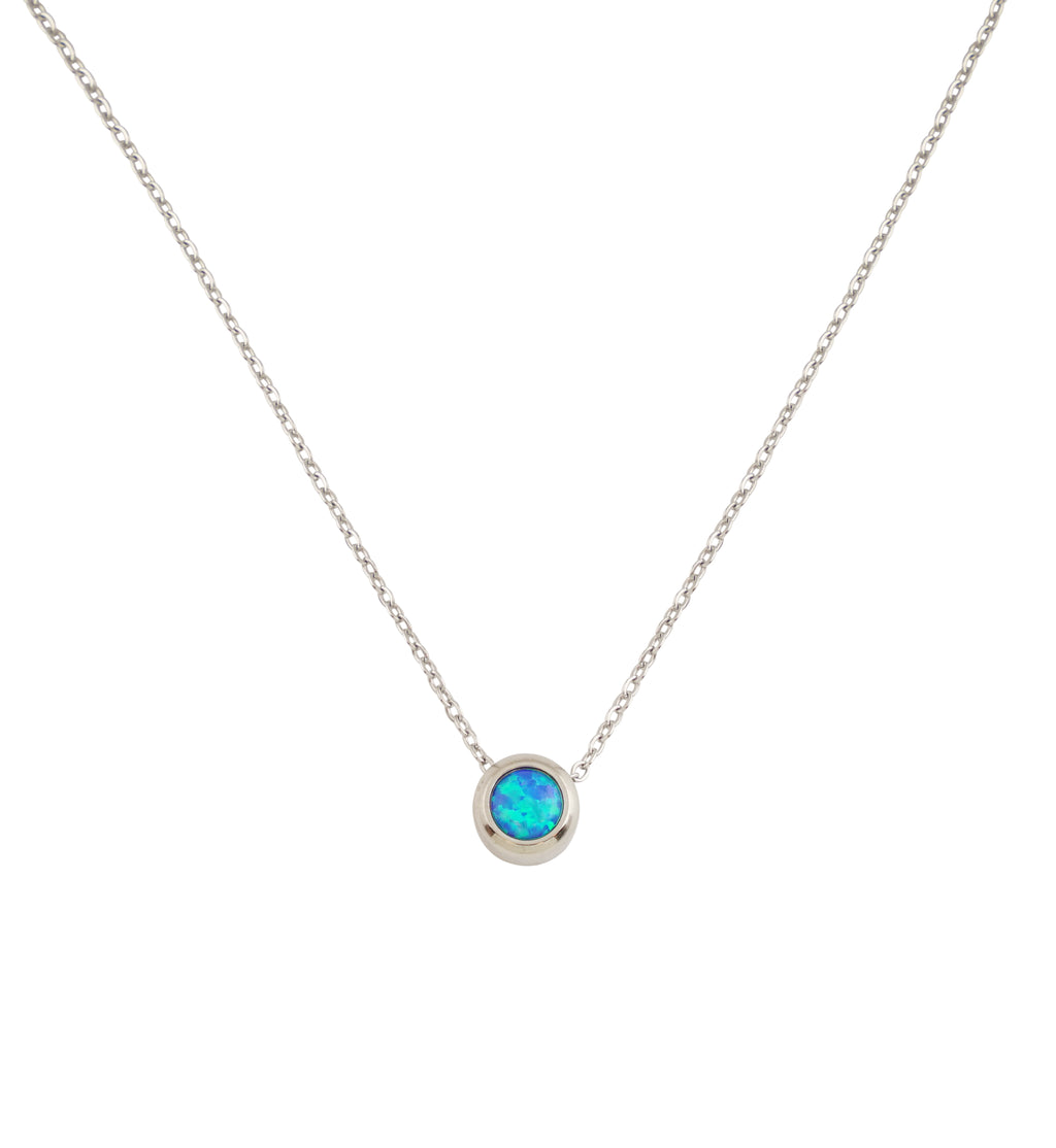 Cable chain necklace with a round, bezel-set, synthetic blue opal pendant. Pendant size is 9mm in diameter while the actual gem size is 6mm. The chain is created from 316L stainless steel. Chain length is about 17.72" (450mm). Thickness is 0.8" (2mm). Sold individually (1pc).