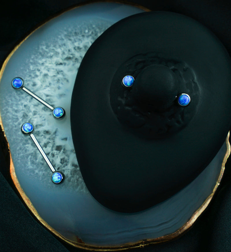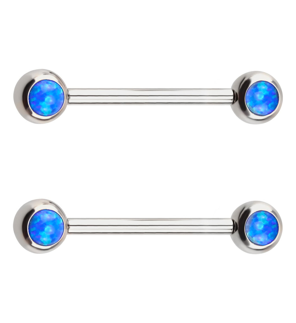 Threadless nipple straight barbells created from surgical 316L stainless steel. On each end there is a bezel set, synthetic blue opal gem measuring at 5mm. The threadless design makes it easy to insert and remove. Size is 14G with an inner barbell length of either 9/16" (14mm) or 5/8" (16mm). Sold in pairs. For healed piercings.