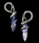 Handcrafted white brass ear weights with a cobra snake design wrapped around a blue sodalite stone piece. Height: 80mm, width: 26mm. Height and width are approximate as these are handcrafted. Size is 2G (6mm) with an approximate weight of 35 grams each. Sold in pairs (2pcs).