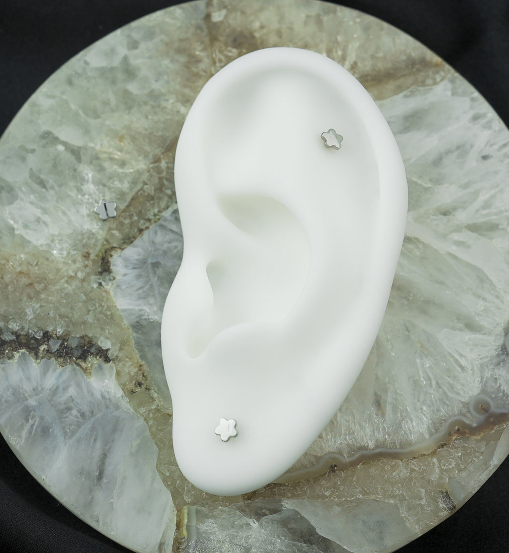 Threadless top piece that has a flower design that has rounded edges. Made from durable ASTM F-136 titanium. The top design measures about 4mm. Great top piece for your cartilage or tragus piercing! Sold individually.