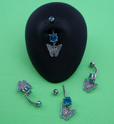 This belly button ring is a sparkling addition to add to your collection! Crafted with 316L stainless steel and featuring a butterfly design filled with pave rainbow aurora cz gems and outlined with aqua cz gems. Complete with two dazzling aqua CZ gems, this piece is designed to fit healed navel piercings and measuring 14G with a 3/8” (10mm) barbell length. The top gem measures 5mm in size, the bottom gem 8mm, and the stunning design measures 14mm x 12mm.