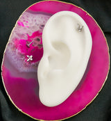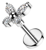 Made from durable ASTM F-136 titanium, this titanium threadless labret has a butterfly design with the wings being clear cz marquise and round gems. In the center is a titanium bead. The design measures about 6mm x 5mm. It is made from ASTM F-136 titanium and has a 25G pin and a 4mm flat back. Sold individually, it is available in size 20G with a 1/4" (6mm) wearable length. Cute labret piece for cartilage piercings!
