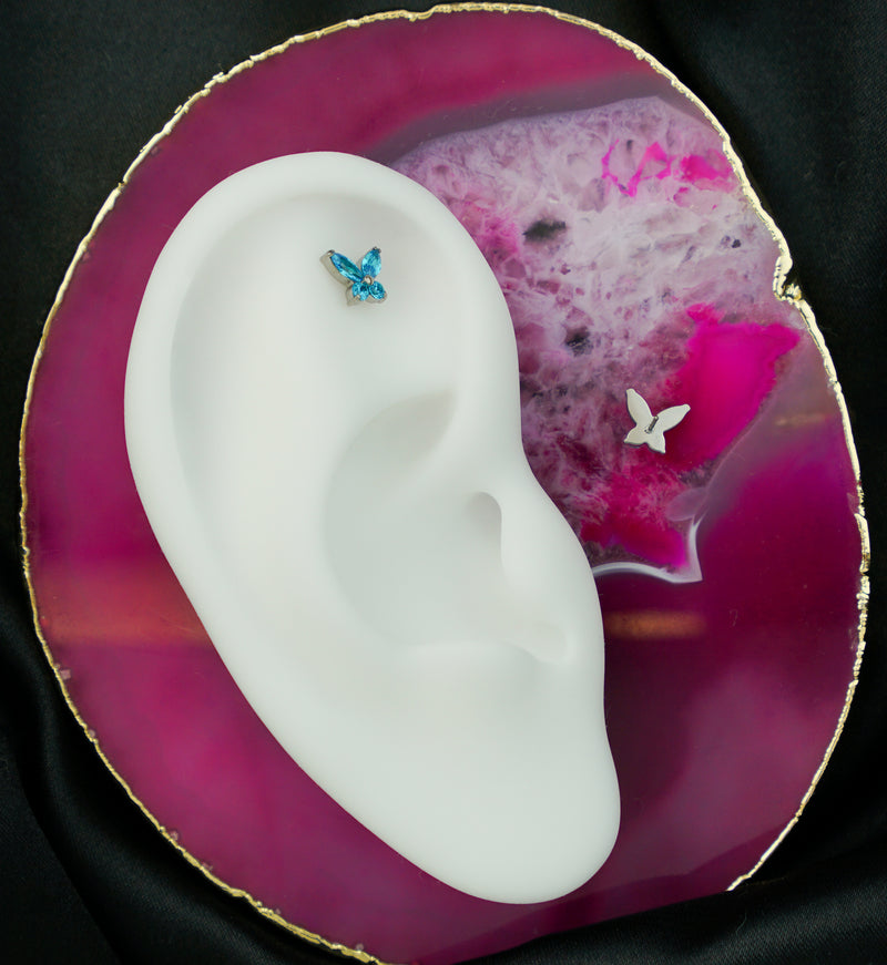 Lovely threadless top piece that has a butterfly design, accented with blue topaz, marquise-shaped, cz gems. Made from durable ASTM F-136 titanium. Measures about 6.5mm x 5.5mm. Size 25G. Fits most threadless posts. Sold individually (top piece only).