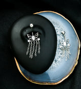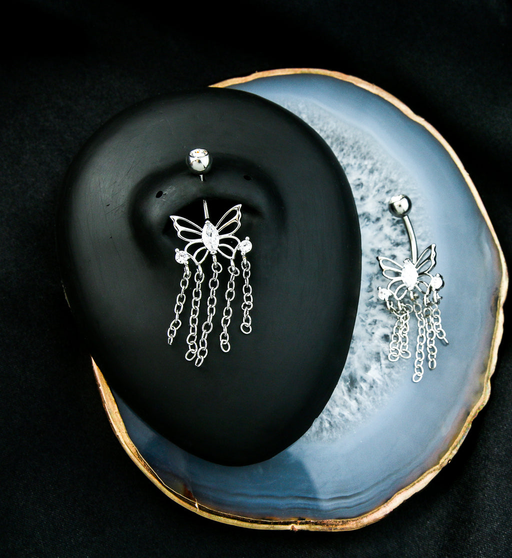 Externally threaded, belly button ring made from 316L stainless steel with a butterfly design that is filled with clear cz gems and accented with five, dangling chains. The design measures about 14mm x 10mm with 20mm dangling pieces. The top clear cz gem is 5mm. Size is 14G with a 3/8" (10mm) length. For healed piercings. Sold individually (1pc).
