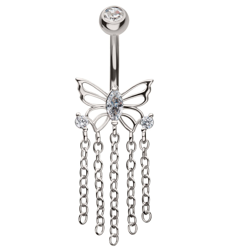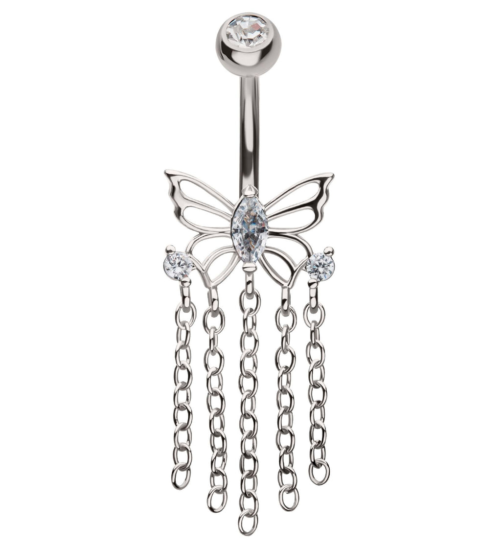 Butterfly Dangle Chains Clear CZ Stainless Steel Belly Button Ring