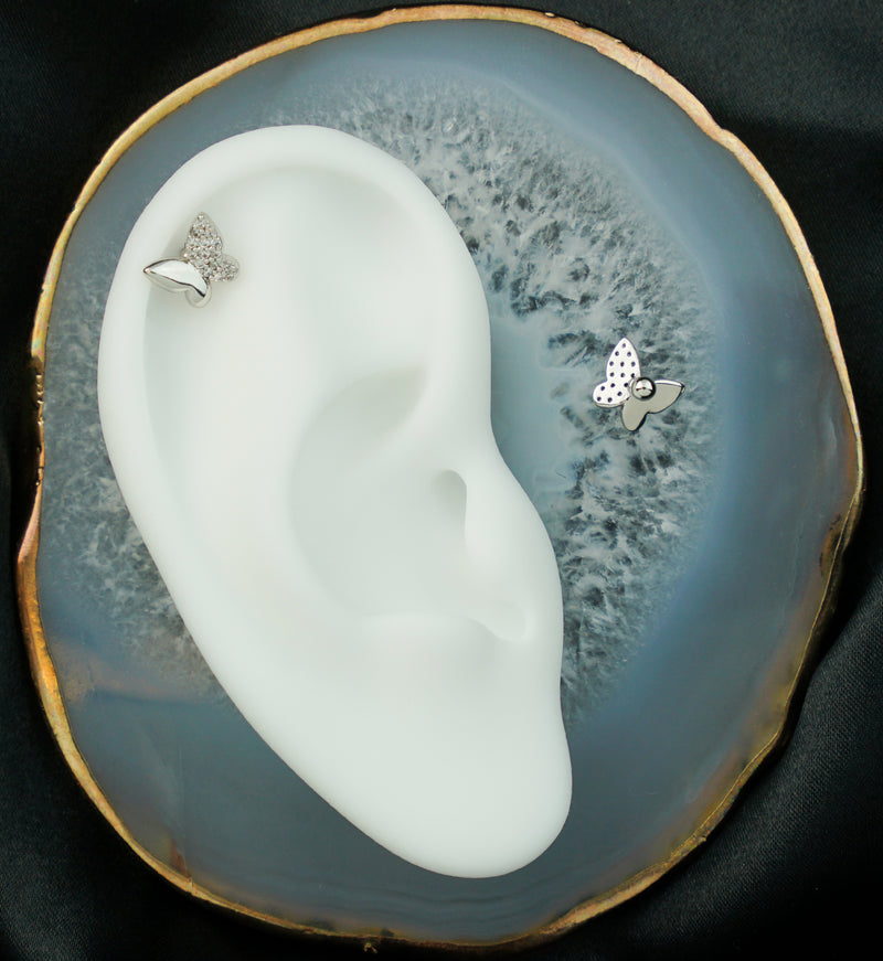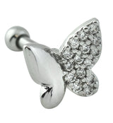 Pretty stainless steel cartilage/tragus barbell with a butterfly design that has half of it filled with pave clear cz gems. It is made from 316L stainless steel and is externally threaded. Great piece for cartilage or tragus piercings! Size is 16G with a bar length of 1/4" (6mm) with a 2.5mm externally threaded ball. Top size is 8mm x 7.5mm. Sold individually. For healed piercings.