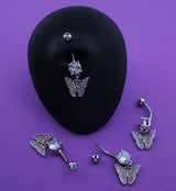 This belly button ring is a sparkling addition to add to your collection! Crafted with 316L stainless steel and featuring a butterfly design filled with rainbow aurora cz gems. Complete with two dazzling clear CZ gems, this piece is designed to fit healed navel piercings and measuring 14G with a 3/8” (10mm) barbell length. The top gem measures 5mm in size, the bottom gem 8mm, and the stunning design measures 14mm x 12mm.