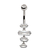Sparkly belly button ring with a dangling, descending, rectangle clear cz design. Size is 14G with a 3/8" 10mm barbell. It is made from 316L stainless steel. Externally threaded. Top cz measures at about 5mm. Bottom gem is about 6mm x 3mm. Bottom dangle design is about 10mm x 19mm. Sold individually (1 pc).