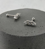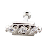 Barbell with a bar shaped end that is filled with a slanted design and three clear cz gems. Made from 316L stainless steel and externally threaded. Fun option for cartilage or tragus piercings! Size is 16G with a bar length of 1/4" (6mm). End size is 3mm x 10mm. Sold individually. For healed piercings.