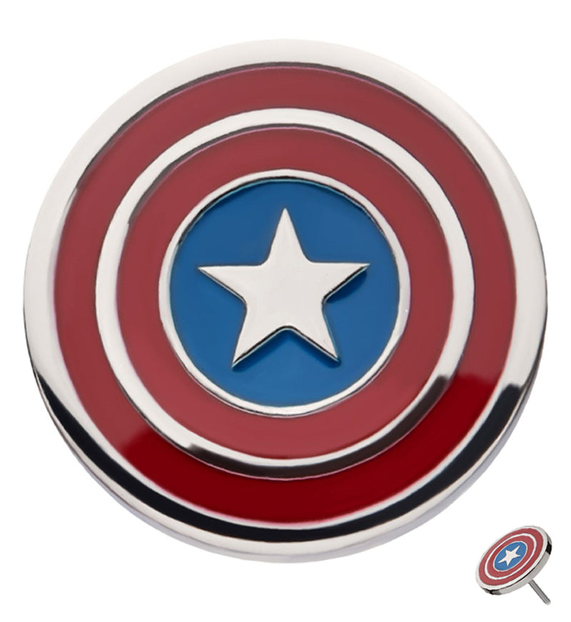 This iconic Captain America Shield is such a fun piece to add to your collection. It is made from ASTM F-136 titanium. 25G titanium pin, measures about 4.7mm in length. Fits most threadless posts. Top piece measures about 6mm. Sold individually (top piece only).