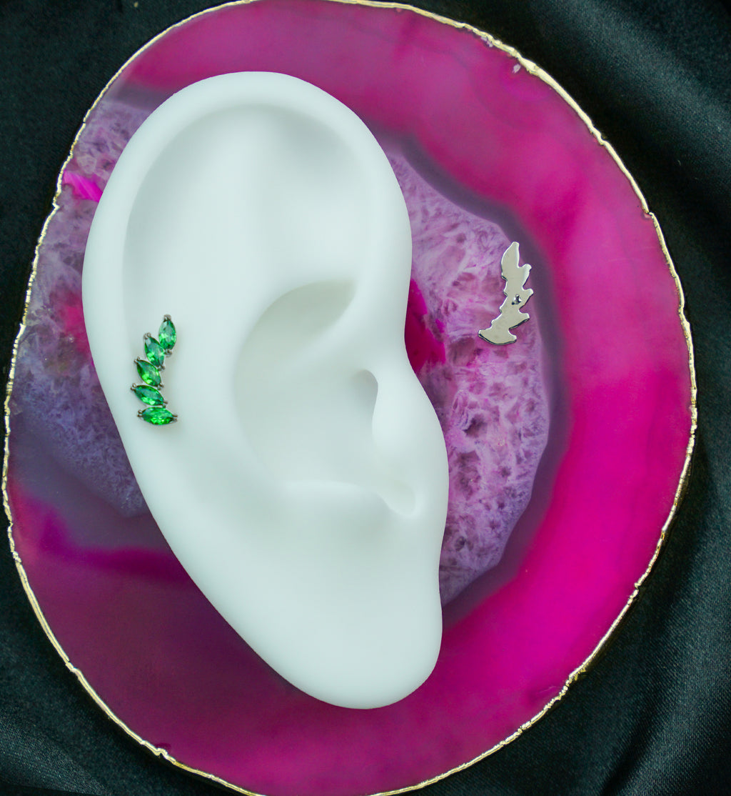 Amazing, threadless top piece created with multiple green marquise cz gems in a curved design. This piece is made from strong ASTM F136 titanium. Top size measures 12.5mm x 5.5mm. Pin length is 5mm and it fits most threadless posts. Sold individually (top only).