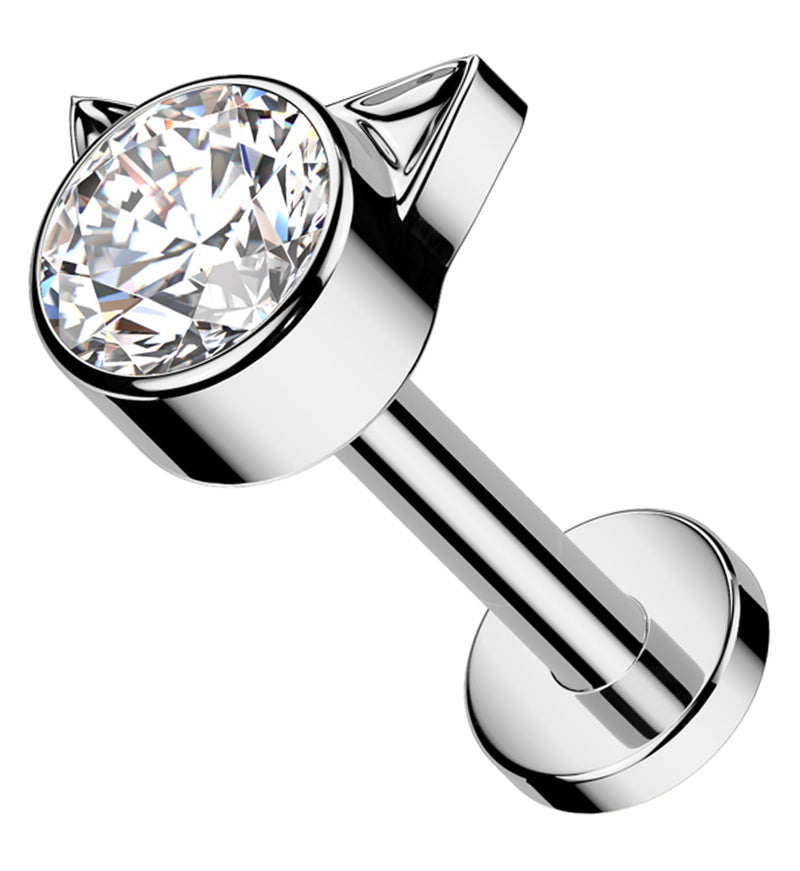 Cute, internally threaded labret has a cat head shape on top that has a round, clear cz gem that measures about 3mm. The flat disc end has a size of 3mm. Size 16G with either a 1/4" (6mm) or 5/16" (8mm) length available. The whole top design measures about 5mm. Made from strong ASTM F-136 titanium. Sold Individually.