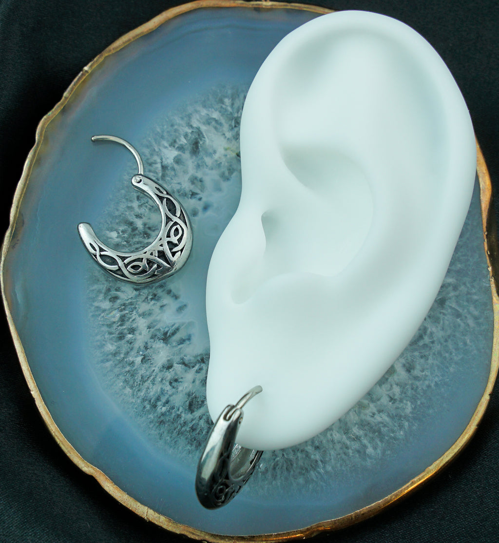 These hoop shaped earrings have a thick edge and an intricate design that has Celtic knots throughout. They are made from 316L stainless steel. They are size 16G with an inner diameter of 3/8" (10mm). Total length is approximately 20mm. The hinged design is easy to open and close. Sold in pairs (2 pieces). Meant for healed piercings.