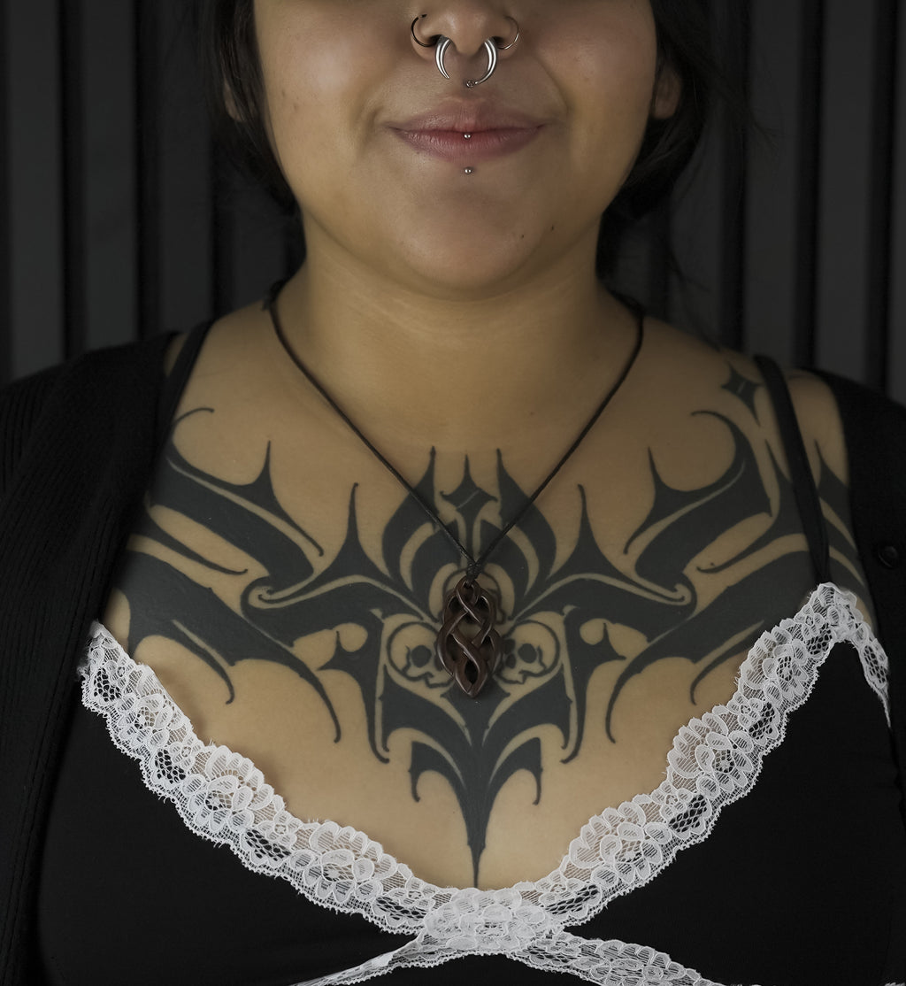 This stylish pendant is made from lightweight narra wood and features a fun celtic knot design measuring 50mm x 26mm. The adjustable cotton cord ensures a comfortable and secure fit. Sold individually.