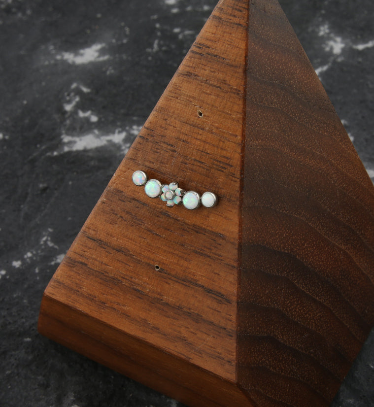 Threadless top piece that has an arched design that is filled with bezel set synthetic white opal gems and a centered flower design. Made from ASTM F-136 titanium. Measures about 14.3mm x 4.3mm. 25G pin. Fits most threadless posts. Sold individually (top piece only).