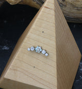 Beautiful threadless top piece that has an arch design that is full of clear cz gems. In the center is a flower design made up of synthetic white opal gems. Made from ASTM F-136 titanium. Measures about 14mm x 4mm. Fits most threadless posts. Sold individually (top piece only).