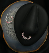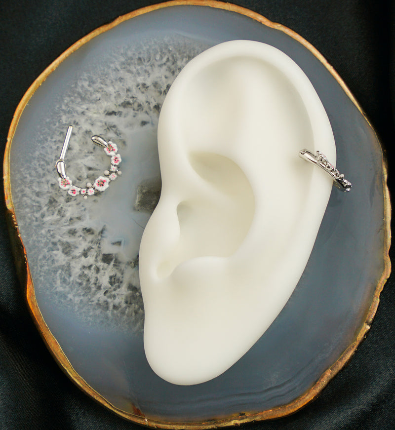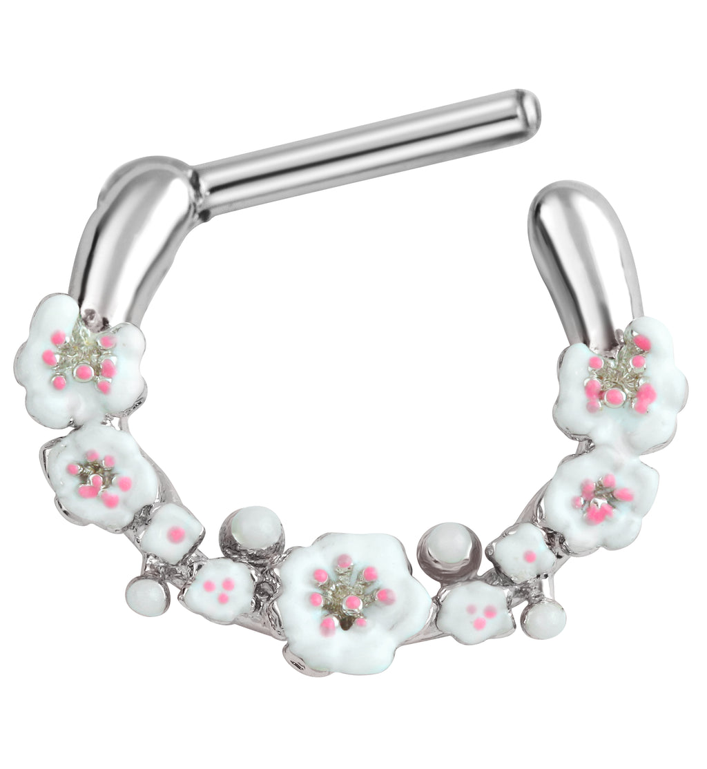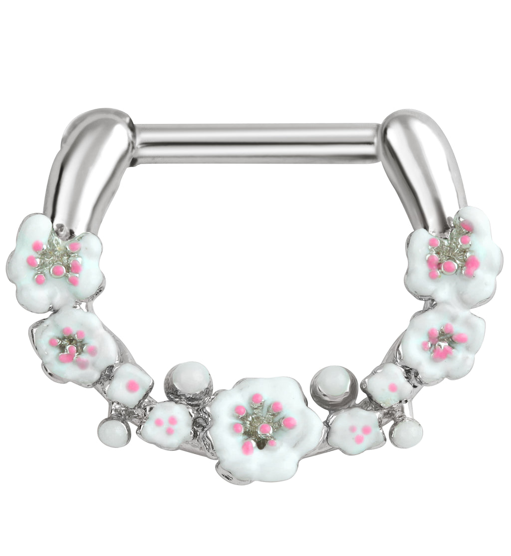 Made from 316L stainless steel, this clicker ring has a straight hinged bar at the top for effortless opening and closing. Along the bottom is a pretty, cherry blossom design that is filled with white and pink epoxy coloring. Size is 16G with an inner diameter size of 5/16"(8mm). Great for septum, daith or cartilage piercings! Sold individually (1pc).