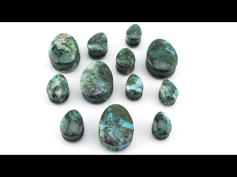 Sold in Pairs (2pc) Limited sizes 1/2" - 1 Inch Double flares Natural Chrysocolla stone Smooth & polished Length: 10mm Width & height size on drop down selection