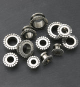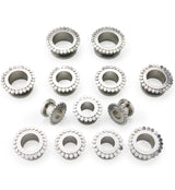 Screw back tunnels plugs with a beaded looking design around the front. Made from 316L stainless steel. Available sizes: 0G (8mm), 00G (10mm), 1/2" (12mm), 9/16" (14mm), 5/8" (16mm). Full Length: 11mm X Wearable area: 6mm. Sold in pairs (2pcs).