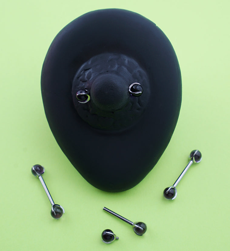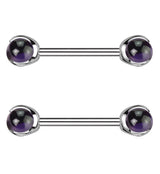 Titanium nipple barbells with internally threaded ends and 5mm amethyst stone gems in a claw prong set. Crafted with ASTM F-136 Implant grade titanium, the 14G barbell is 9/16" (14mm) long. Sold in pairs (2pcs).