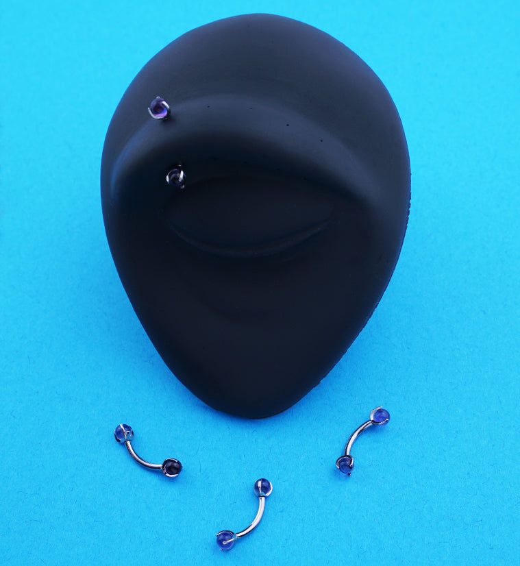 Simple curved barbell made from ASMT F-136 titanium and two claw set amethyst stone ball gems on the ends. Internally threaded on both ends. The length is 5/16" (8mm) with a 16G size. Cool piece to add to your jewelry collection! Sold individually (1pc).
