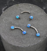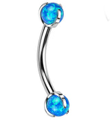 Simple curved barbell made from ASMT F-136 titanium and two claw set synthetic blue opal gems on the ends. Internally threaded with 3mm gems. The length is 5/16" (8mm) with a 16G size. Fun piece to add to your jewelry collection! Sold individually (1pc).