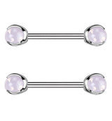 Titanium nipple barbells with internally threaded ends and 5mm pink opal glass gems in a claw prong set. Crafted with ASTM F-136 Implant grade titanium, the 14G barbell is 9/16" (14mm) long. Sold in pairs (2pcs).