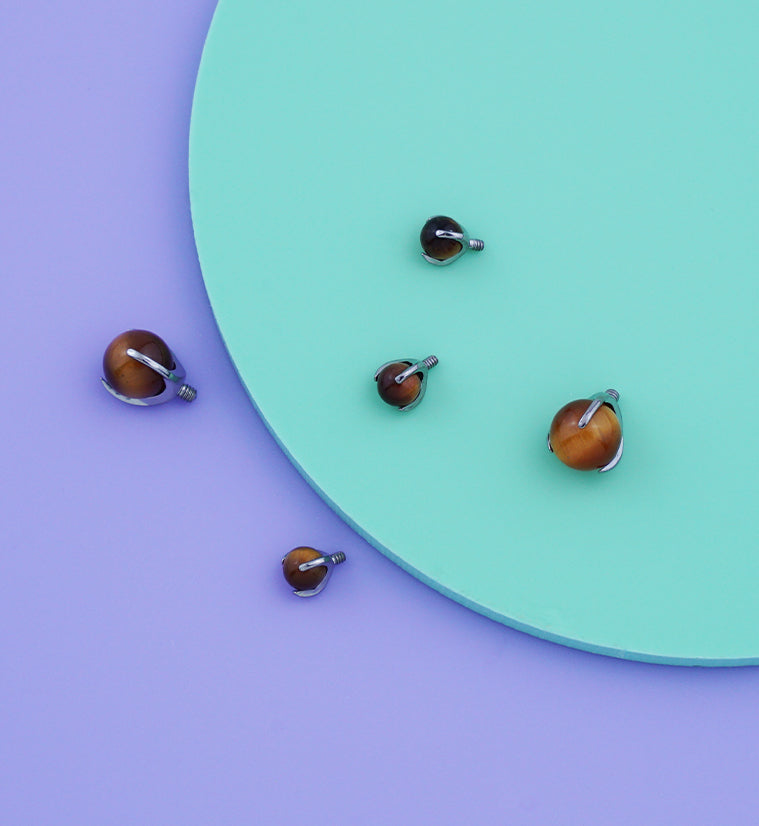 Tiger's eye stone ball tops set in a claw prong design with an internally threaded design. Size is 16G or 14G. M0.9 and M1.2 threading. Made from natural tiger's eye stone and ASTM F-136 titanium. Pick your stone size from 3mm (16G) or 5mm (14G). Sold individually (1pc).