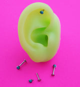 Internally threaded labret piece that has a round, 3mm dyed turquoise howlite stone ball and a 4mm flat disk back. Made from ASTM F-136 titanium. Size is 16G with a 5/16" (8mm) length. Sold individually (1pc).
