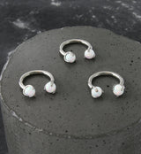 Titanium internally threaded circular barbell with two 3mm, claw set, synthetic white opal gem balls. Size 16G with an inner diameter of 5/16" (8mm). Internally threaded. Great for septum piercings! Sold individually (1pc).