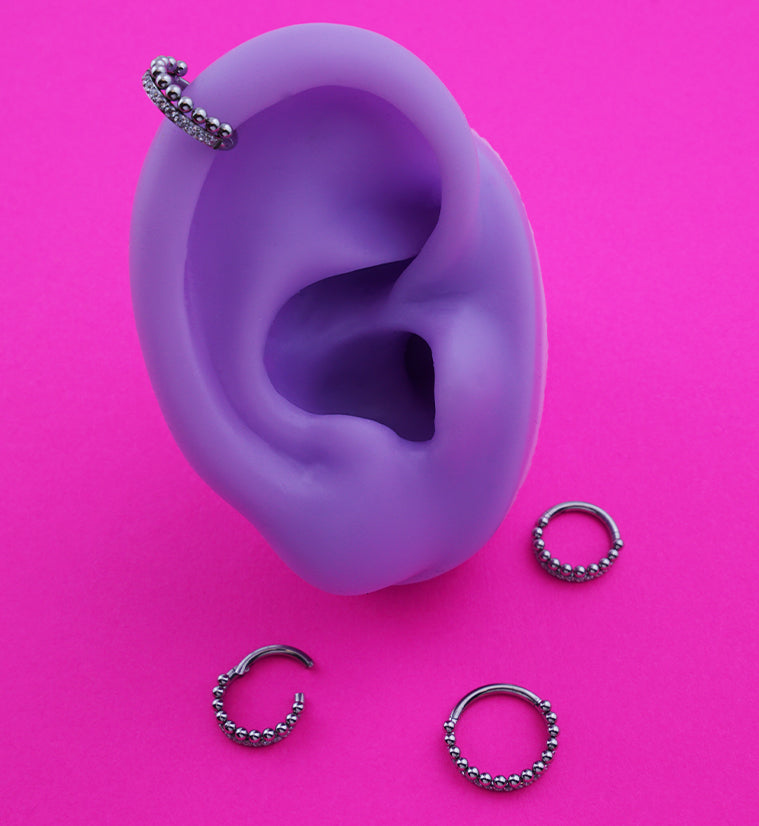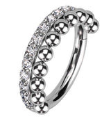 Hinged segment ring made from 316L stainless steel with a hoop design that has two rows: one lined with clear cz gems and one lined with beads. Size is 16G with an inner diameter size of either 5/16" (8mm) or 3/8" (10mm). The hinged design makes this piece easy to insert and remove. Sold individually (1pc).