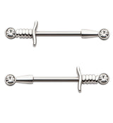 These Clear CZ Dagger Stainless Steel Nipple Barbells are crafted from 316L stainless steel with sparkling clear cubic zirconia gems. They have a dagger or sword design that goes through the nipple. Each barbell has a 9/16" (14mm) wearable area and is sized 14G. Externally threaded and meant for healed piercings. Sold in pairs (2pcs).
