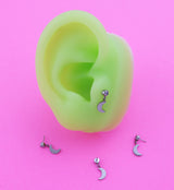 This titanium top is sold individually and made from the highest quality ASTM F-136 titanium with a bezel set 2mm clear cz gem with a dangling crescent moon attached. Moon measures about 6mm x 4mm in size. Top is designed to fit most threadless posts with a 25G pin. Fun style to add to your piercing!