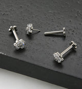 Threadless labrets with a sparkling flower shape made up of clear cz gems on top and a flower shaped back. Size is 16G. Length is 5/16" (8mm). Flower back is 4mm. Made from ASTM F-136 titanium. Sold individually (1 pc).