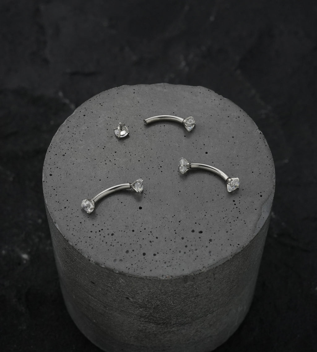 Simple curved barbell made from 316L stainless steel and two prong set clear cz gems on the ends. Internally threaded with 3mm gems. The length is 5/16" (8mm) with a 16G size. Sparkling piece to add to your jewelry collection! Sold individually (1pc).