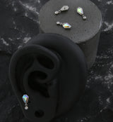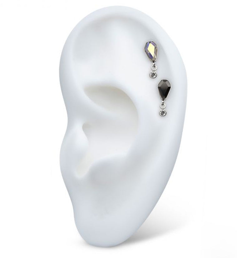 Internally threaded top piece that has a coffin design that is made from a rainbow aurora cz gem. Complete with a dangling 2mm clear cz gem. Size is 16G with M0.9 threading. Made from ASTM F-136 titanium. Design measures about 12mm x 5mm. Sold individually (1pc, top only).